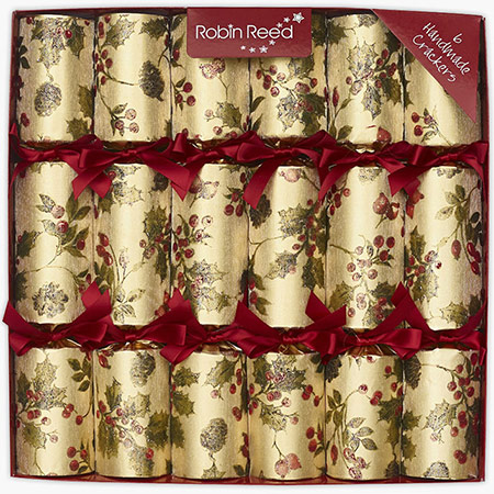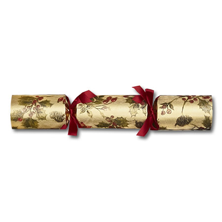 Description: These beautiful antiqued gold crackers are printed with a garland-like pattern of holly sprigs and other berry vines. The gathers of the cracker are also decorated with deep red satin ribbon. Each cracker contains a paper crown (folded tissue party hat), a motto (British joke or riddle), the cracker-snap, and one item from our Robin Reed Luxury Gift Selection.