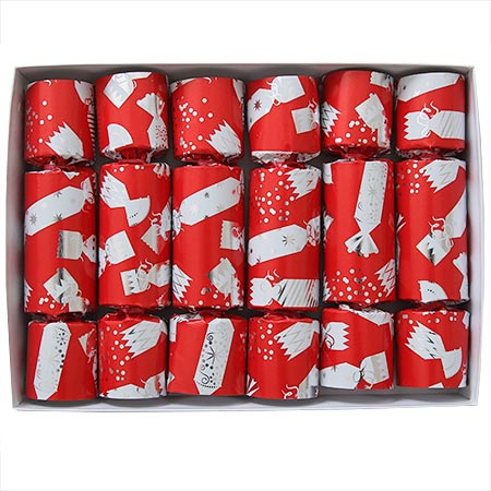 Description: This bright red cracker is printed with sparkling images of silver and white Christmas crackers.  Crackers contain a paper crown (folded tissue party hat), a motto (British joke or riddle), the cracker-snap, a small game book, and an item from our Puzzle and Game Gift Selection.
