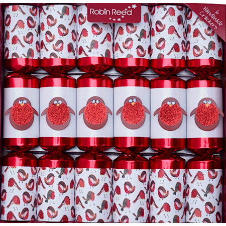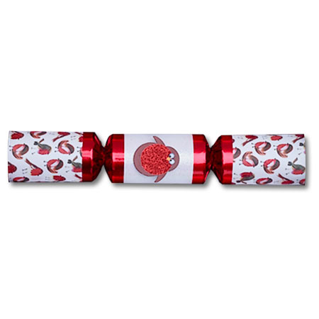 Description: This new addition to Robin Reed’s line of Racing Crackers features glittering red robins on a white background. The center of the cracker is shiny pearl white and decorated with a glittering robin cutout. Each cracker contains a wind up Robin character that you race on the included track, as well as a tissue crown, the traditional English motto, and of course the cracker snap.