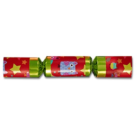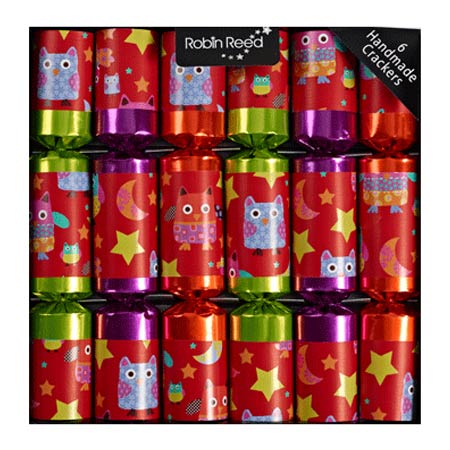 Description: A set of 6 brightly colored foil crackers each decorated with fun images of owls, moons and stars. Crackers contain a paper crown (folded tissue party hat), a motto (British joke or riddle), the cracker-snap, and a make yourself animal activity set.