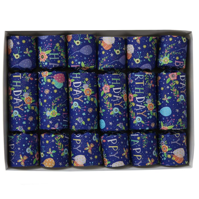Description: This rich blue birthday cracker is decorated with images of flowers, balloons, and butterflies. Each cracker contains a paper crown (folded tissue party hat), a motto (British joke or riddle), the cracker-snap, and one of our small, handy household gadgets.
