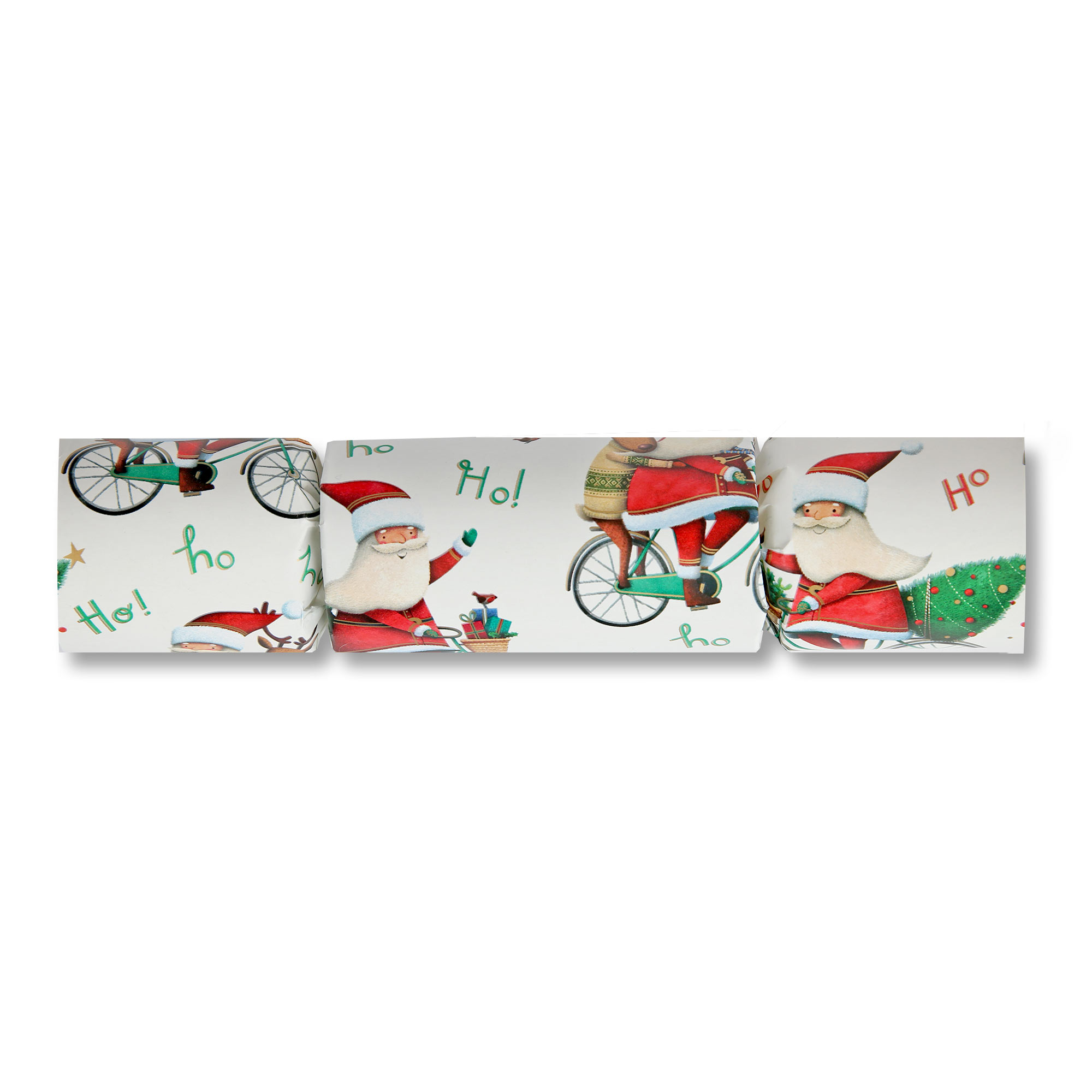 Description: This classic white cracker is printed with images of Santa on his bike and on the go with his animal friends and Christmas treats in tow. Each cracker contains a paper crown (folded tissue party hat), a motto (British joke or riddle), the cracker-snap, and an item from a carefully selected range of fun party toys and gadgets.
