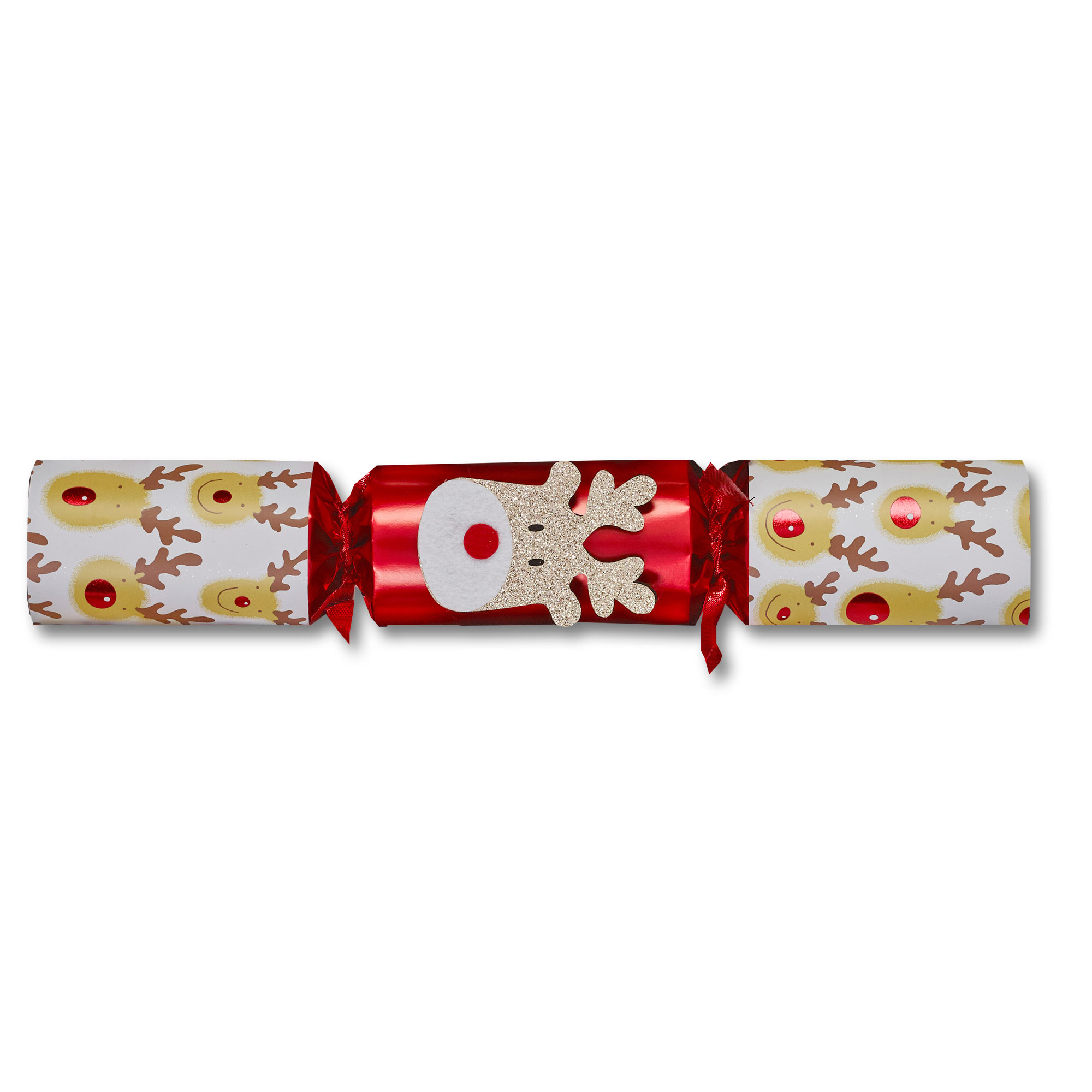 Description: What could be more fun than 6 wind-up reindeer toys racing across your table top. Each 13-inch white cracker is decorated with red bows at the gathers and has a red, shiny-nose reindeer at the middle. The crackers are filled with a wind-up reindeer toy, a tissue crown and the motto. A track for racing the reindeer toys also is included in the package.