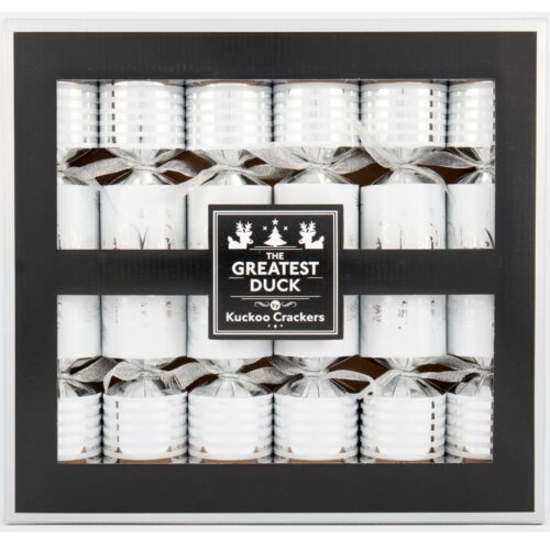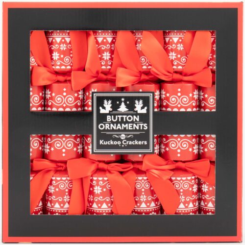 Description: These elegant paprika red crackers are printed with cream-colored images of foliage and floral buds. The gathers of the crackers are decorated with large white ribbon bows. Each cracker contains a paper crown (folded tissue party hat), a motto (British joke or riddle), the cracker-snap, and one item from our Robin Reed Ultimate Luxury Gift Selection.