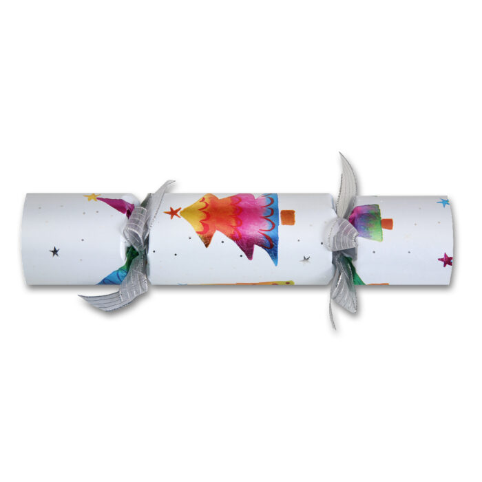 Description: This vivid white cracker is printed with colorful cartoonish trees and decorated with sheer silver ribbon at the gathers. Each crackers contains a paper crown (folded tissue party hat), a motto (British joke or riddle), the cracker-snap, and 2 bite size offerings from the pure origin mini chocolate bar collection of renowned French Chocolatier, François Pralus.